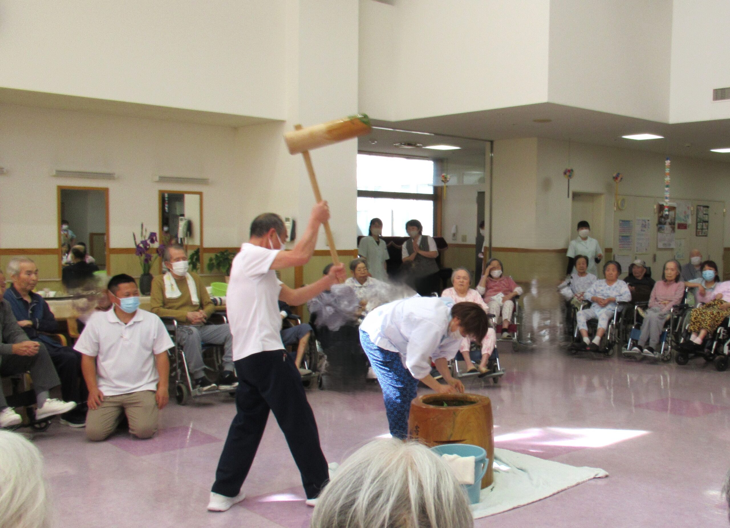 草餅つきもありました。鮮やかなヨモギ色の、柔らかくおいしい草餅ができました。杵をつくときの皆さんの掛け声がタイミング良く見事にそろい、その息の合い方に、若かりし頃のお姿が重なるようでした。
